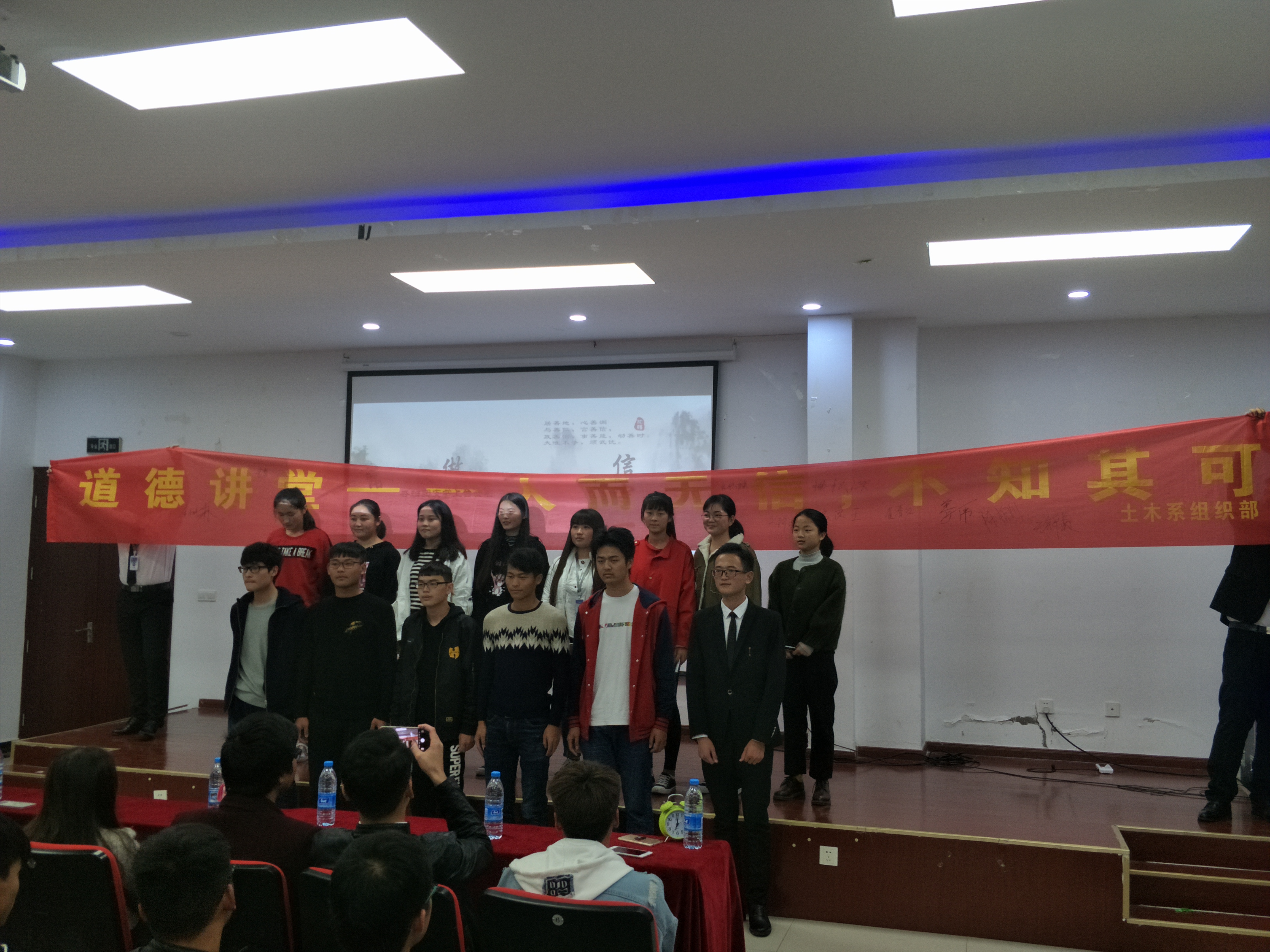 讲堂开始主持人给大家介绍了四维八德,介绍了古人尊信首德的准则。画面一转播放了一段感人之余带走教育的微电影,讲述的是一个贫困患病带着孙女的老人为已逝的儿子还贷的故事,把诚信的可贵突显的淋漓尽致。接着是一出情景剧《作弊记》,是一个学生联合作弊后来悔恨不已的小喜剧。同学们搞怪的表演让观众们捧腹大笑。然后是刺激的击鼓传球游戏,鼓声停止时,球在谁的手中就得回答一个关于诚信的问题。同学们球到手中慌张传递,小礼堂里顿时欢声笑语,热闹无比。紧接着是诗歌朗诵,三名同学声情并茂的朗诵引得阵阵掌声,还有搞笑有趣的相声表演颇受欢迎。压轴的是一首《浮夸》,精彩的演唱、迷人的歌喉把活动推向高潮。活动结束后各班团支书上台签名并合影留念,本次活动完美落幕。