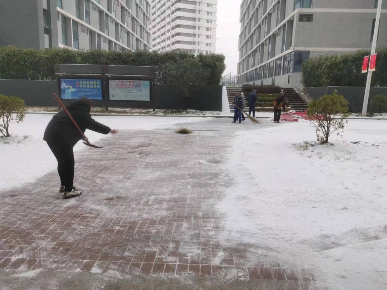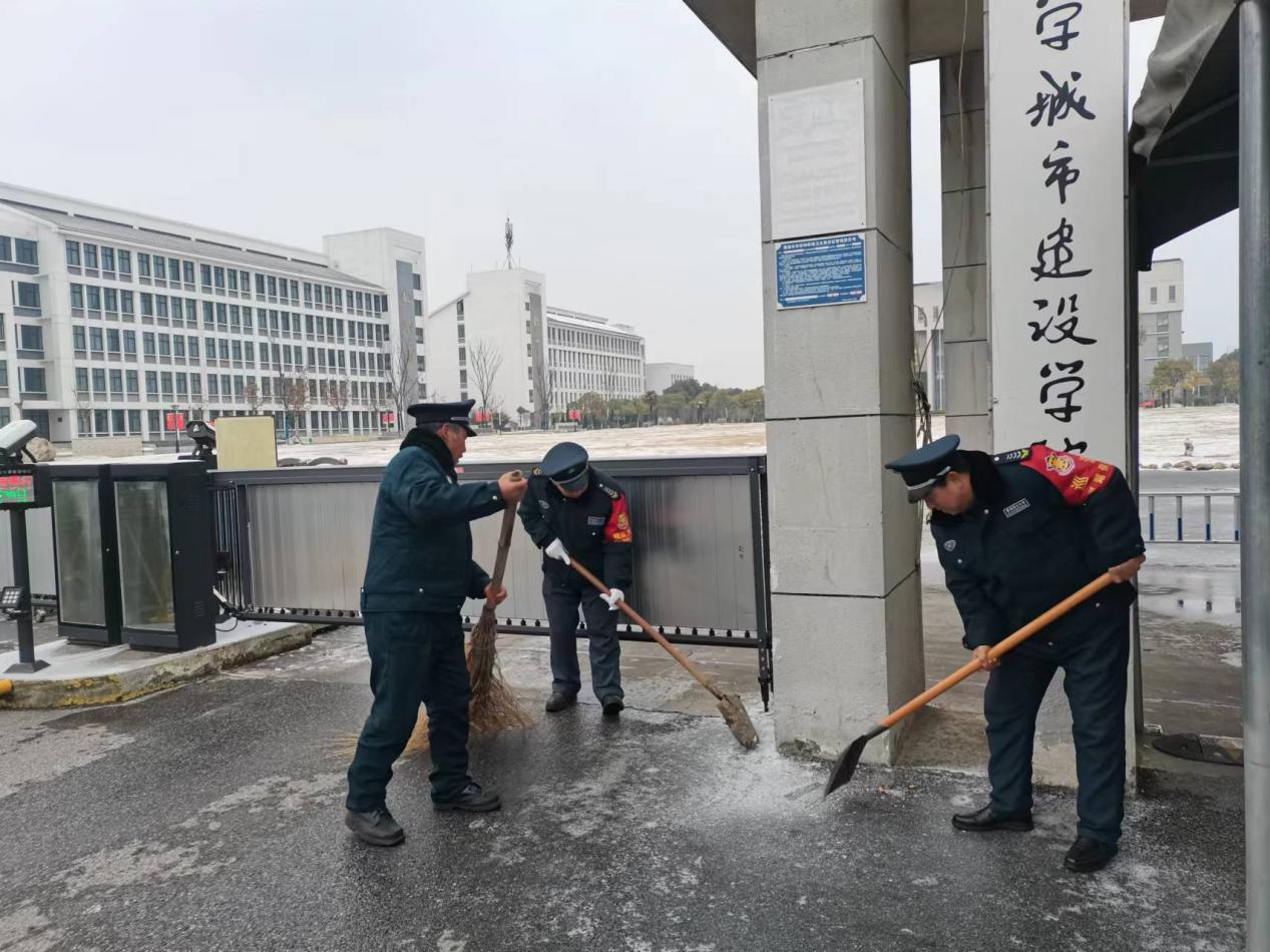 除雪防冻中,后勤保卫处提前安排物业保洁人员在校园道路泼撒融雪剂,保安队员手持铁锹、扫帚等工具全面投入到扫雪除冰工作中,顶着刺骨的寒风,一锹一锹地将冰块铲起,大家紧紧围绕“以雪为令、随下随清、多措并举、雪停路净”的工作原则和要求,有条不紊地持续开展清扫积雪的行动。