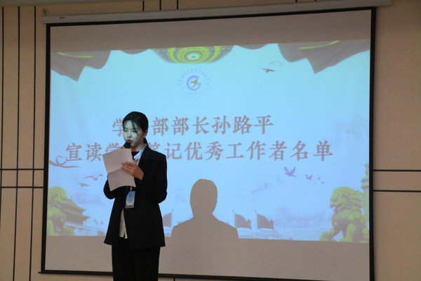 大会伊始,全体成员起立共唱共青团团歌。随之,学科部部长孙路平宣读学霸笔记优秀工作者名单,学生会副主席孙世昱为获奖者颁奖。之后,组织部考核组组长陈玉琳公布各部本学期期末考核结果。紧接着,由主席团代表刘苗苗上台详细地总结了本学期的工作成果并宣读了本学期的优秀干事、优秀部长以及优秀部门。接近大会尾声,学生会指导老师胡怡凡老师上台致辞,对本学期的工作进行总结并嘱咐学生会全体成员能够保持初心,怀着最初的热情去对待工作和学习。