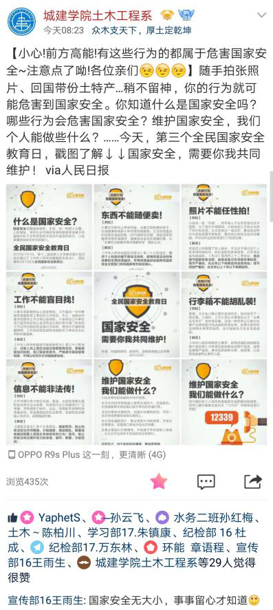 在4月13-15日期间,土木系学生会利用QQ公众号、微博、海报、横幅等方式,对国家安全教育日进行了多方面和多角度的宣传推广,宣传互动效果良好。