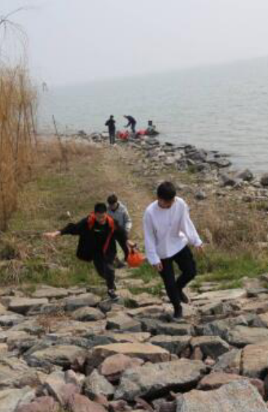 巢湖之滨,在阳光明媚的日子里,同学们齐心协力共同挖坑取水,种下一颗颗小树苗。