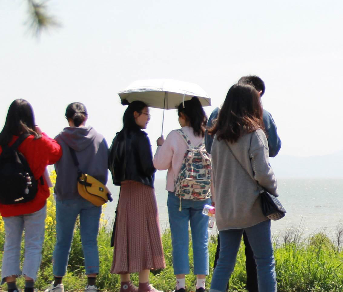 同学们在巢湖四处留下了脚步。同学们或结伴散步于干道上,或踏着碎石迎向湖水,远远望去,没有尽头,天是蓝的,水是绿的,天际连成了一片,在这里似乎可以倾听到大自然的声音。