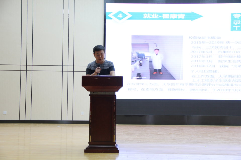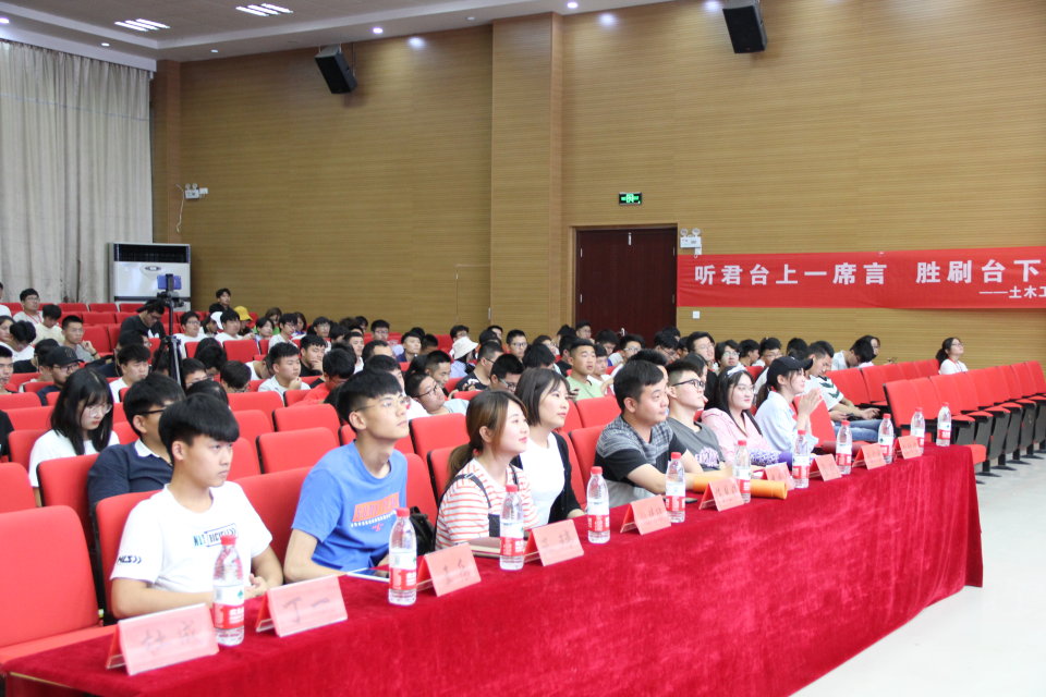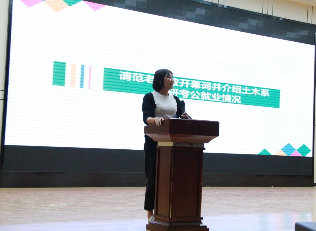 2019年5月28日晚7点,土木工程系优秀毕业生经验交流会在图书馆二楼大礼堂举行。出席的嘉宾有土木工程系党总支副书记范慧娟老师,土木工程系团总支书记、18级辅导员姚靖璇老师,以及考研优秀代表张继宝学姐、张广虎学长,考公优秀代表金鹏学长,就业优秀代表瞿康青学长。