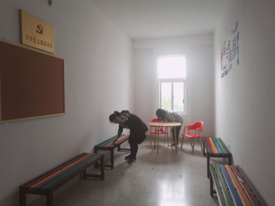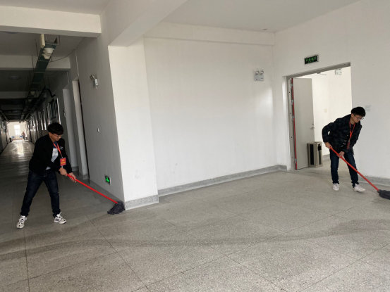 党员同学们顶着寒冷的天气,中午12点半纷纷赶到实验楼,有序合理分配任务,男生负责拖地,女生负责擦拭桌椅、板凳以及墙画、海报、门窗。由于打扫区域偏大,拖把不够用,为更好更快的打扫卫生,同学们自主去教室借拖把。