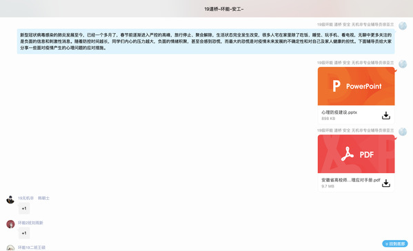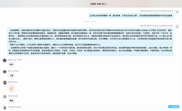 为提高同学们对新型冠状病毒肺炎疫情的了解与认识,深入贯彻落实习近平总书记关于打赢疫情防控阻击战重要指示精神,进一步推进学校新型冠状病感染毒肺炎疫情工作,土木系辅导员徐亚兰通过QQ群的形式,召开了新型冠状病毒肺炎疫情防控网络主题班会,参与班会的有19级道桥、安工、环能、无机非四个专业。