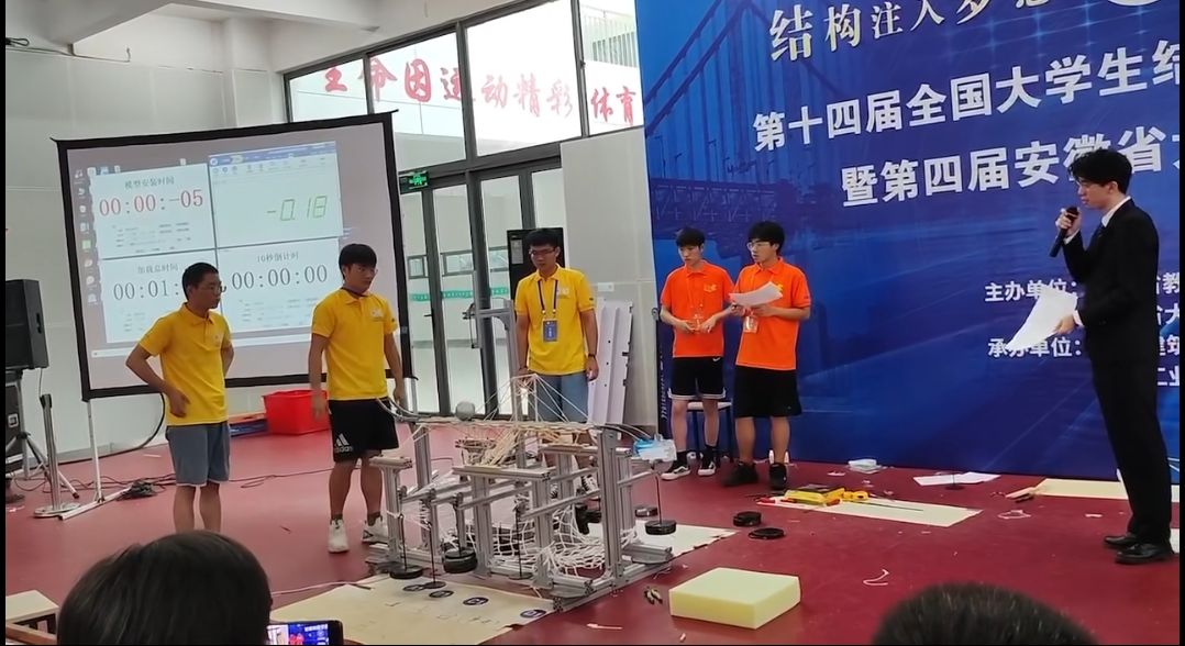 终于,轮到我院参赛队伍进行加载,每位成员从容镇静、配合默契,按部就班一步一步进行加载。随着一级加载的成功,队员们心中的底气似乎更足,紧接着,二级加载也成功了;最后,当三级加载的铅球从桥的一端缓缓落下,稳稳地落在了桥另一端的海绵上时,全场欢呼,所有人为这份喜悦纷纷鼓掌。队员们热泪盈眶,一颗悬着的心终于放了下来。