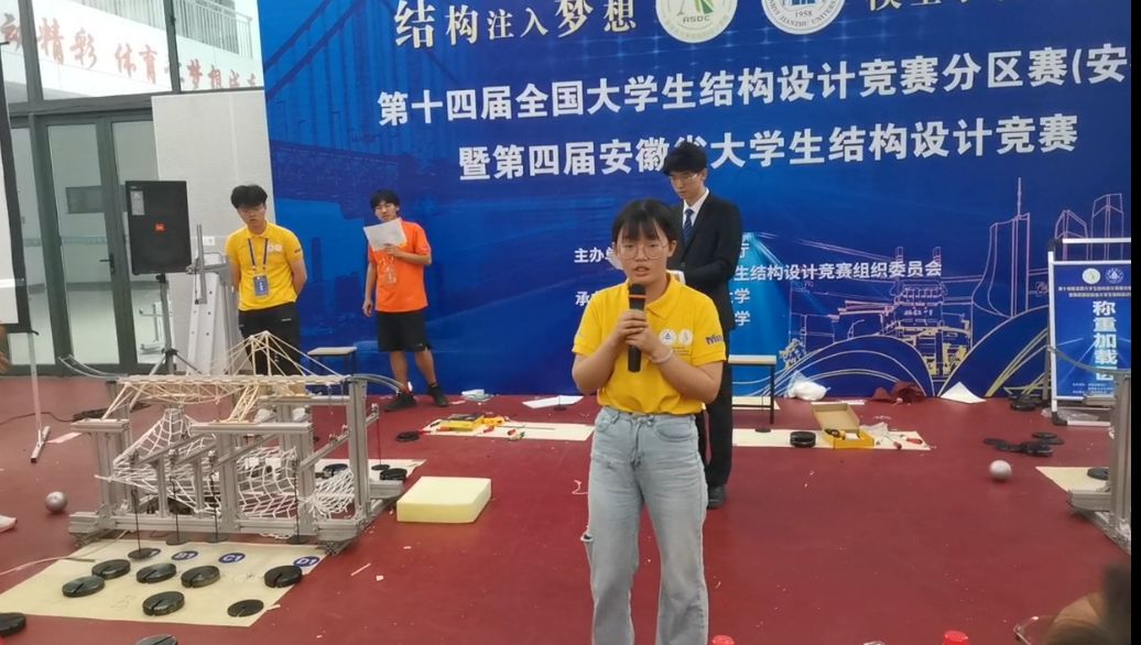 加载过程共分为三个环节,即预安装、现场陈述答辩、以及正式加载。每一支参赛队伍需提前候场,在三分钟内完成预安装,固定好模型,安装桥面板。待主持人向各专家评委介绍完队伍后,参赛代表进行1分钟陈述来介绍模型的构造思想,并回答各专家评委老师的问题。最后,正式进行三级加载,共计5分钟时长。