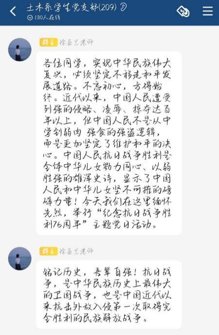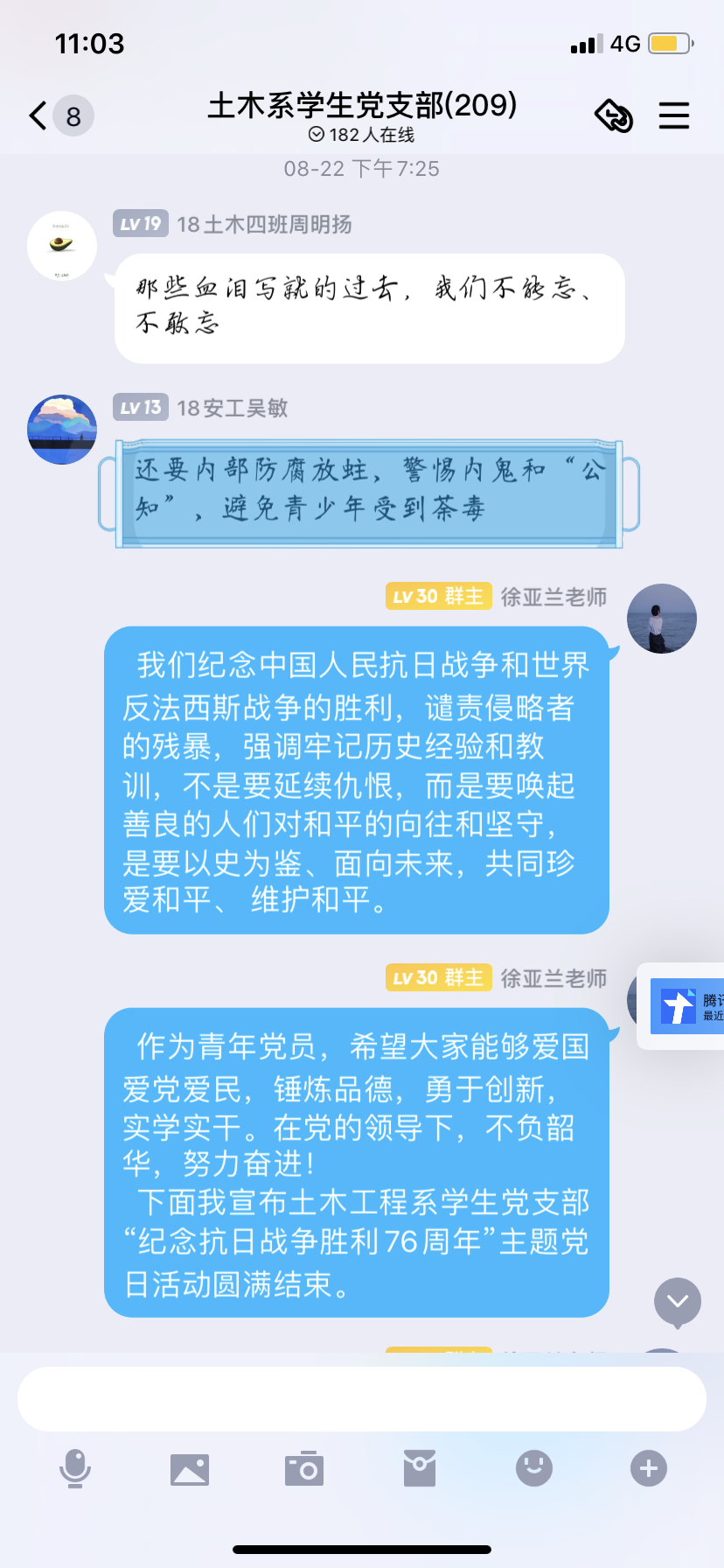 8月15日晚上7点,土木工程系学生党支部组织全体党员开展“纪念抗日战争胜利76周年”主题教育党日活动,本次活动旨在缅怀烈士,弘扬以爱国主义为核心的抗日精神,作为共产党员应牢记使命,勿忘先辈。