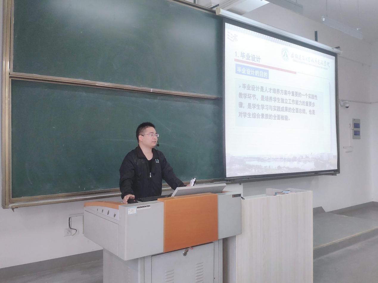 随后,胡祥星老师介绍了毕业设计的安排情况,毕业设计是人才培养方案中最后一个实践性教学环节,是培养学生独立工作能力的重要过程,是学生学习与实践成果的全面总结,也是对学生综合素质的全面检验。同学们要认真对待毕业设计,在指导老师的指导下独立完成。