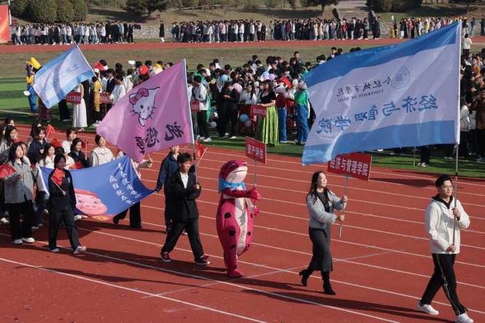 随后,是激动人心的入场式环节。映入眼帘的有国旗班仪仗队,彩旗方阵,志愿者、裁判员、教职工代表队及4个学院代表队。各班级方阵以创意十足的队形、响亮的口号、多彩的服装,按既定顺序有序入场,彰显出了各自的班级文化和团队精神。